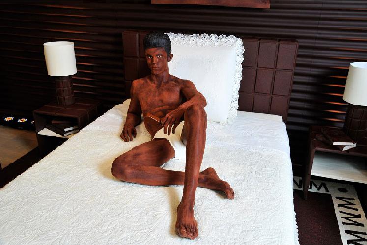 Karl Lagerfeld has designed a hotel suite made entirely out of chocolate (yes, just like in Charlie and the Chocolate Factory). Everything is made out of dark and light chocolate. Bed, walls, blanket and pillows (with laces), furniture - everything that's there. Firstly you might think you see a beautiful alive man. But in fact, that's just the chocolate version of real - yes, Baptiste Giabiconi, mentioned above.
